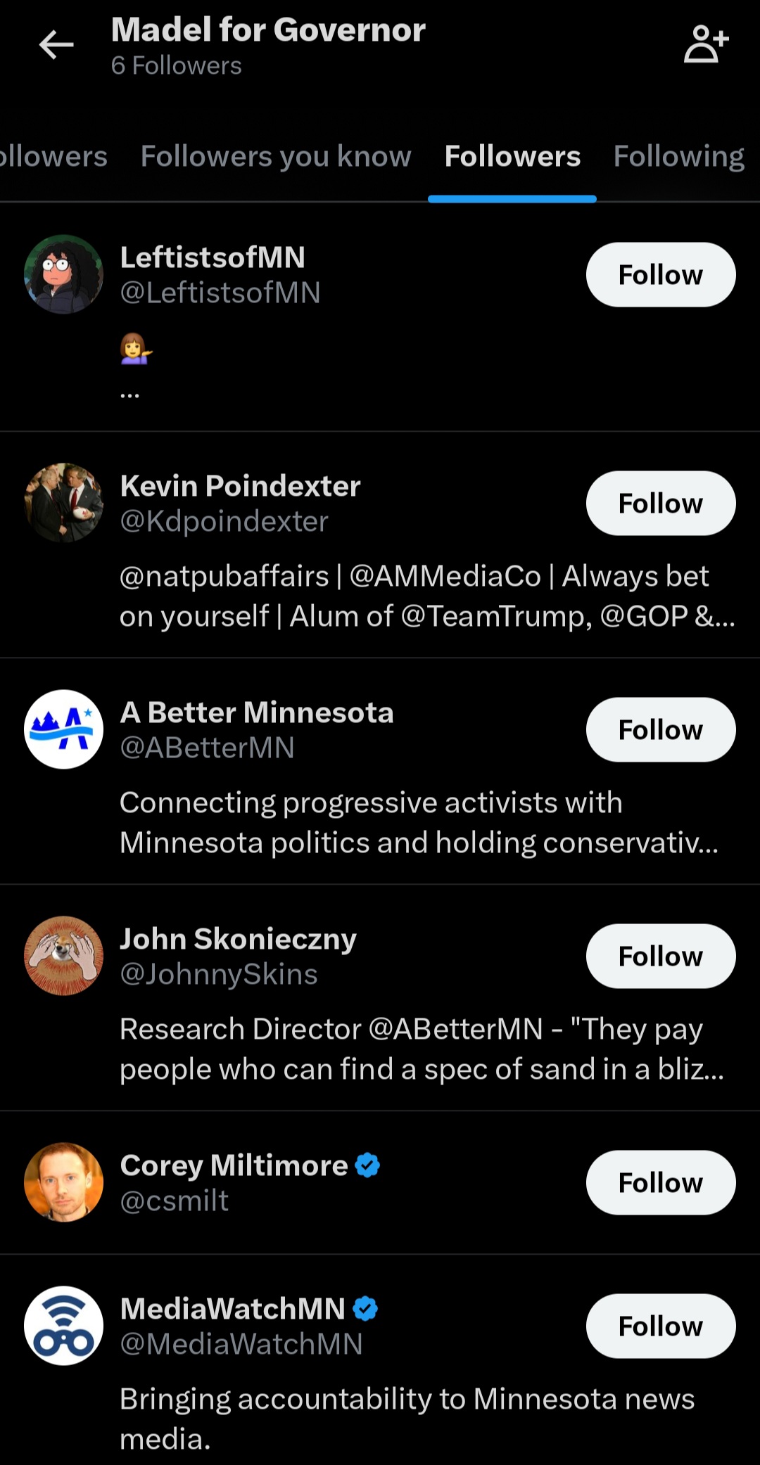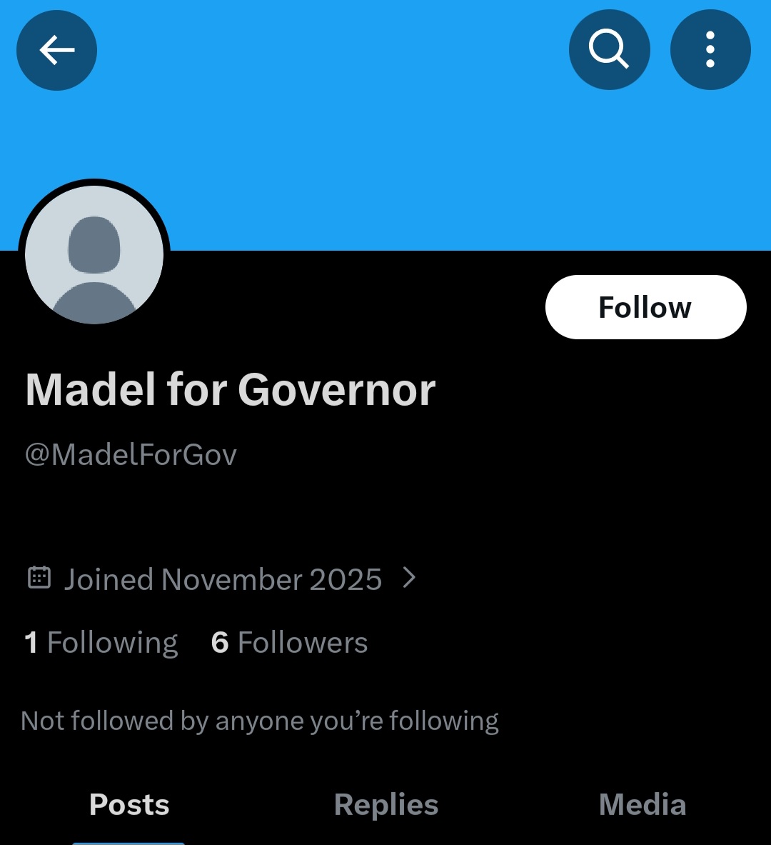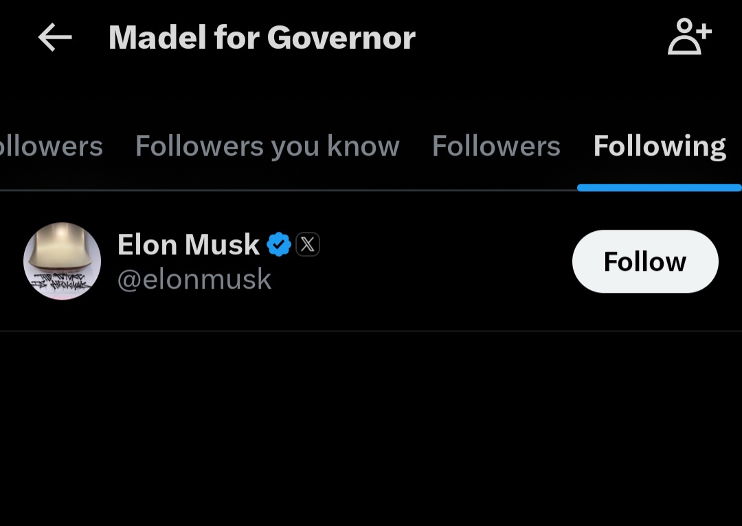 A Madel for Governor X page can be found online with six followers. The only account that the page is following is Elon Musk. See below: