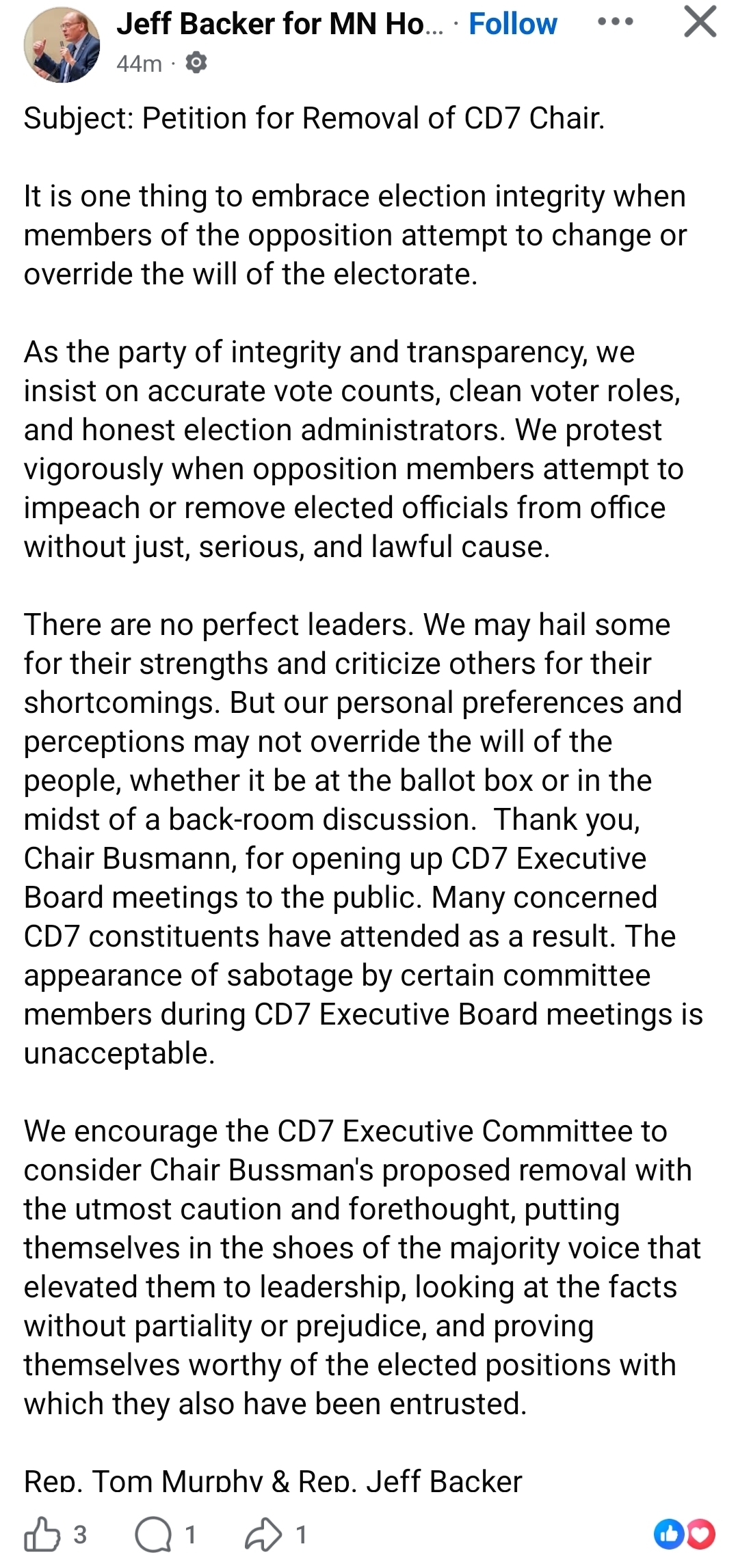The CD7 executive committee can still do the right thing and reject the removal petition to stand with the delegates that elected Bret Bussman. Anything less proves the establishment fears grassroots conservatives having power more than they fear losing to Democrats. The liberty wing of the party is watching and will not tolerate backroom coups against the conservatives they elected.