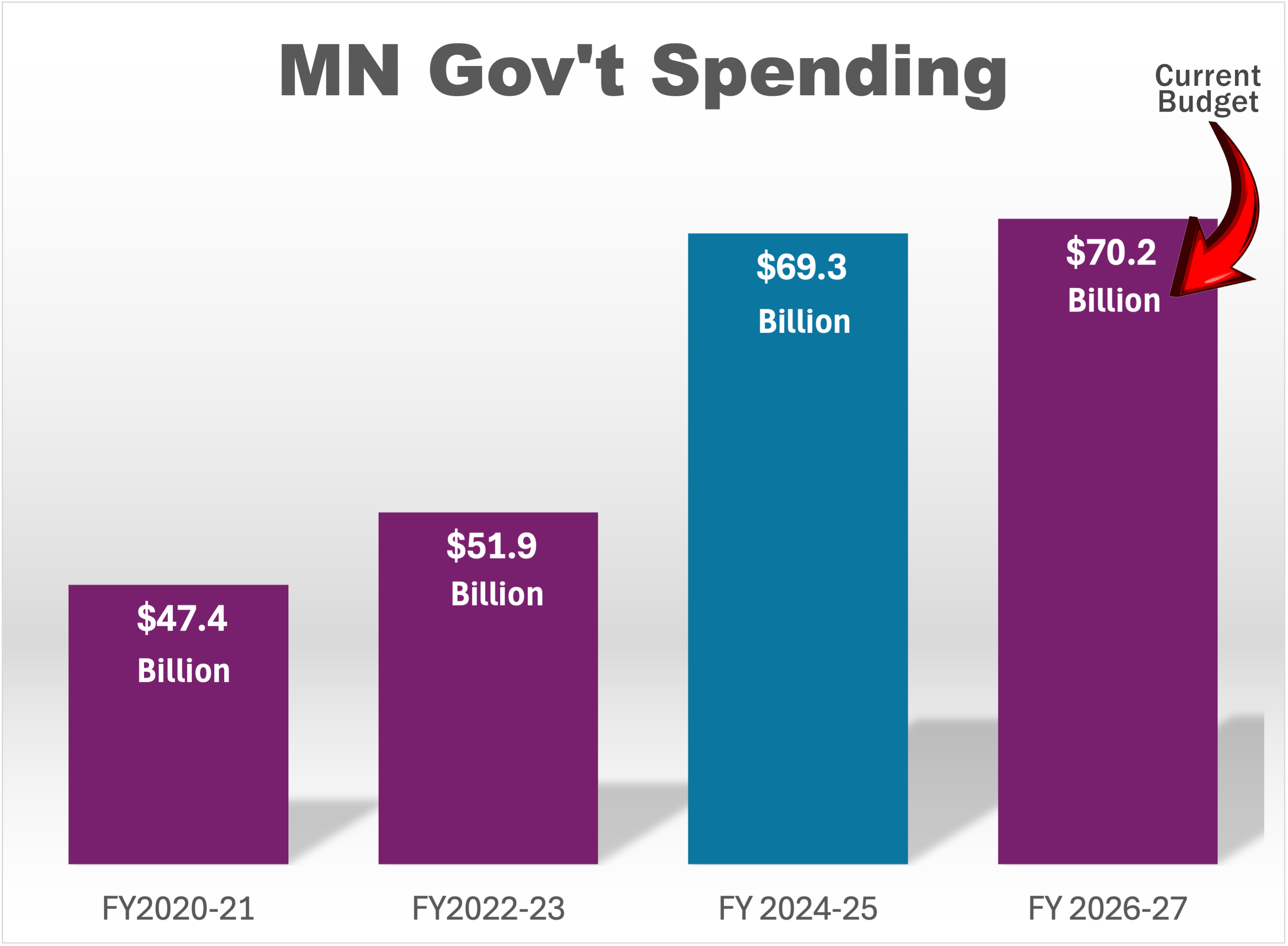 Demuth and House Republicans initially proposed a state budget that eerily totaled $66.6B and Minnesotans were told that the final state budget number agreed to behind closed doors with Tim Walz was a little over $66B. A4L and grassroots conservatives demanded the budget be brought back to pre-Covid spending levels but RINOs instead cemented in Democrat trifecta spending. See a graphic below that shows spending levels over the years. Purple represents a split legislature while blue represents the Democrat trifecta. As seen below, Demuth and RINO leadership did not give us a spending cut from the Democrat trifecta, we are actually on pace to spend MORE in this biennium than the Democrat trifecta: