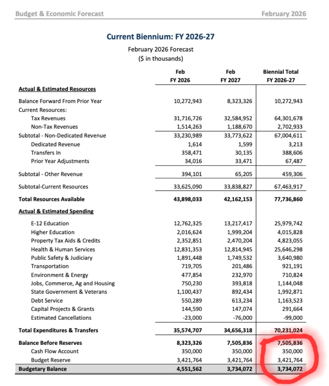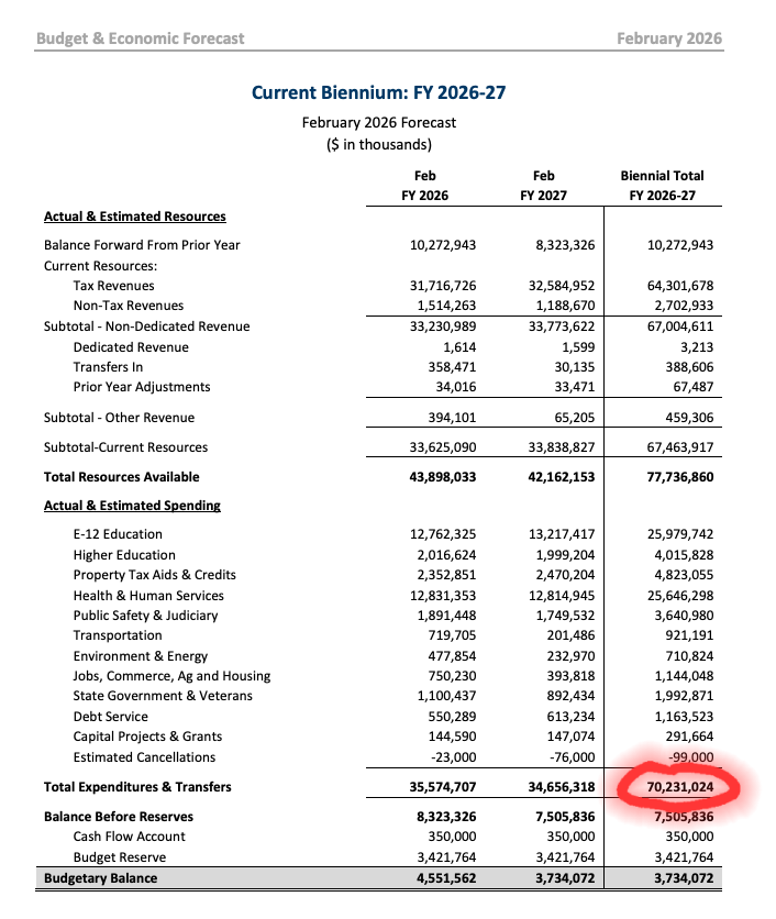 When you view the February 2026 budget forecast, you realize that the GOP was not telling the truth about the spending levels they passed within unconstitutional omnibus bills. The spending total for the budget will be over $70.2B! This is barely a cut from Democrat spending levels and it maintains the fraud and corruption our state has been nationally exposed for. See circled section below showing how much Minnesota’s government is actually spending: