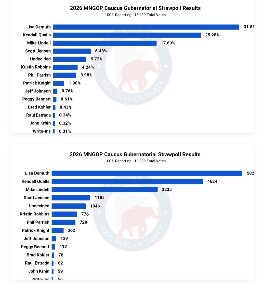 As mentioned, a candidate that raised over $550K and has over $372K cash-on-hand as of Dec. 31st 2025, one would think that this candidate would perform well in polling. Unfortunately for RINO Kristin Robbins, she lost to NOBODY! More GOP caucus attendees selected “Undecided” than Robbins in the caucus straw poll! Kristin Robbins is more like Nikki Haley than many would have thought since Nikki ALSO lost to ‘None of the Above” in the Nevada primary when President Trump was kept off the ballot. See caucus straw poll results below, cut off results are due to the MNGOP website formatting: