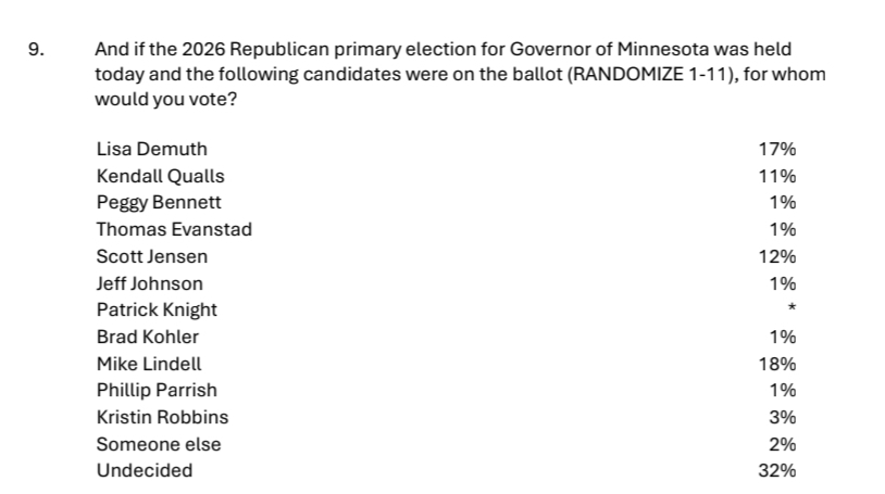 Polling released from Peak Insights included 500 participants and asked about various MN Republican primary elections. The full poll can be seen here. Notably, Mike Lindell led the pack with 18% while a plurality of voters remain undecided. See polling below:
