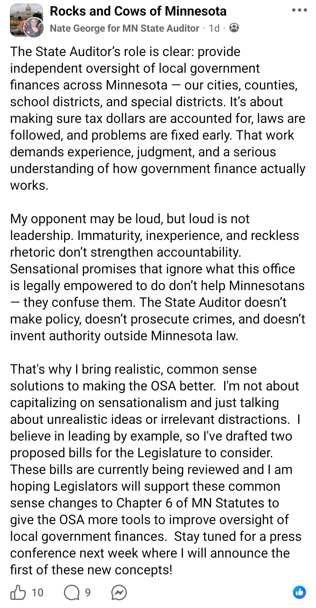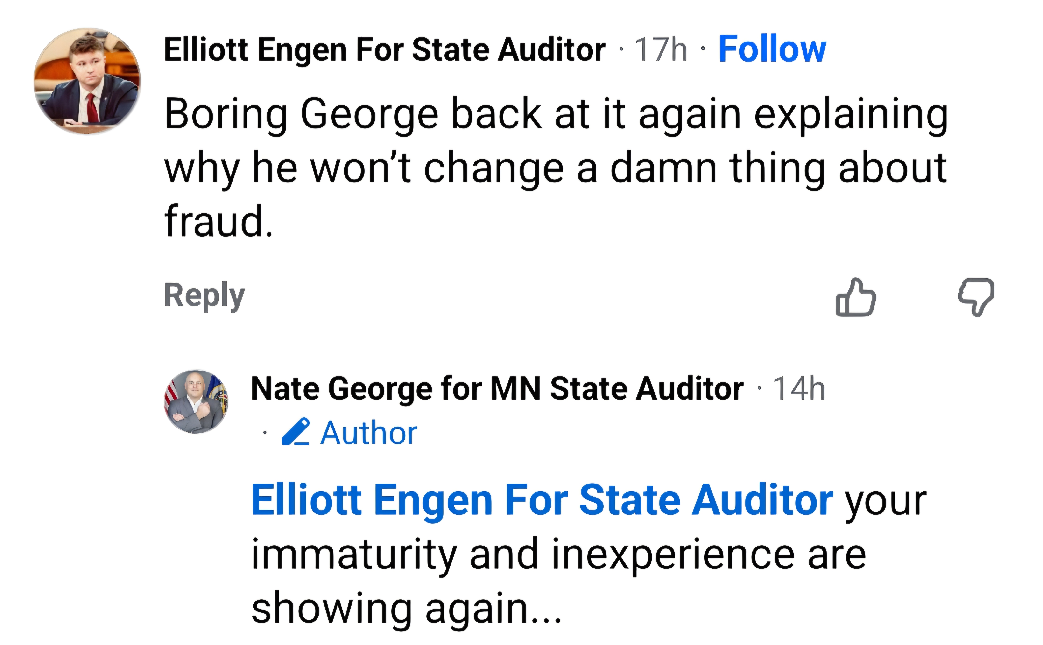 It was clear that Jensen had no intention of abiding by the MNGOP endorsement while in the Governor’s race and it’s unlikely anything is different for the Auditor race. Sources tell A4L that Elliott Engen has refused to answer if he will abide by the endorsement while Nate George has unequivocally publicly pledged to abide. Nate George also appears to be the only candidate with relevant professional experience who has directly worked with the Auditor’s office.