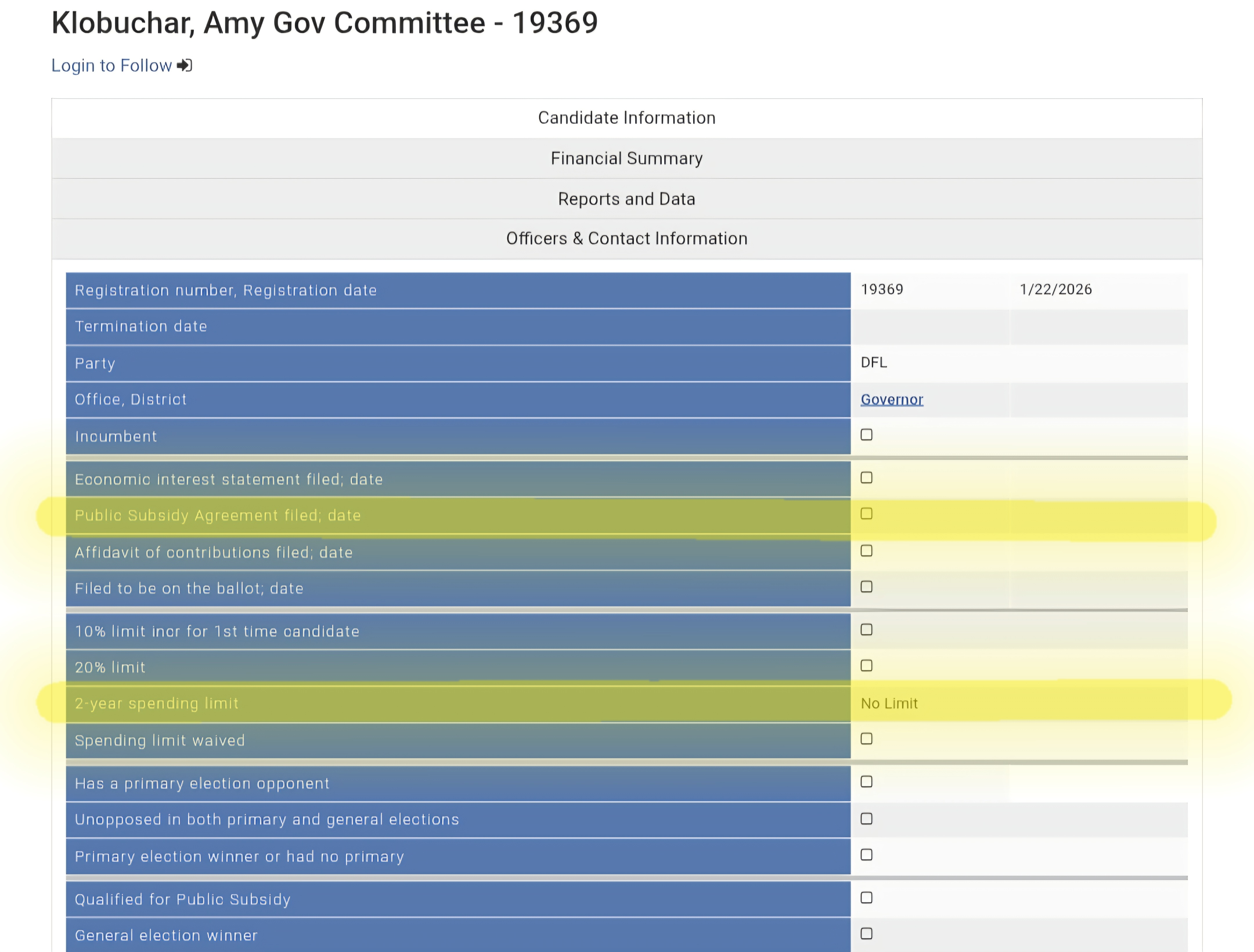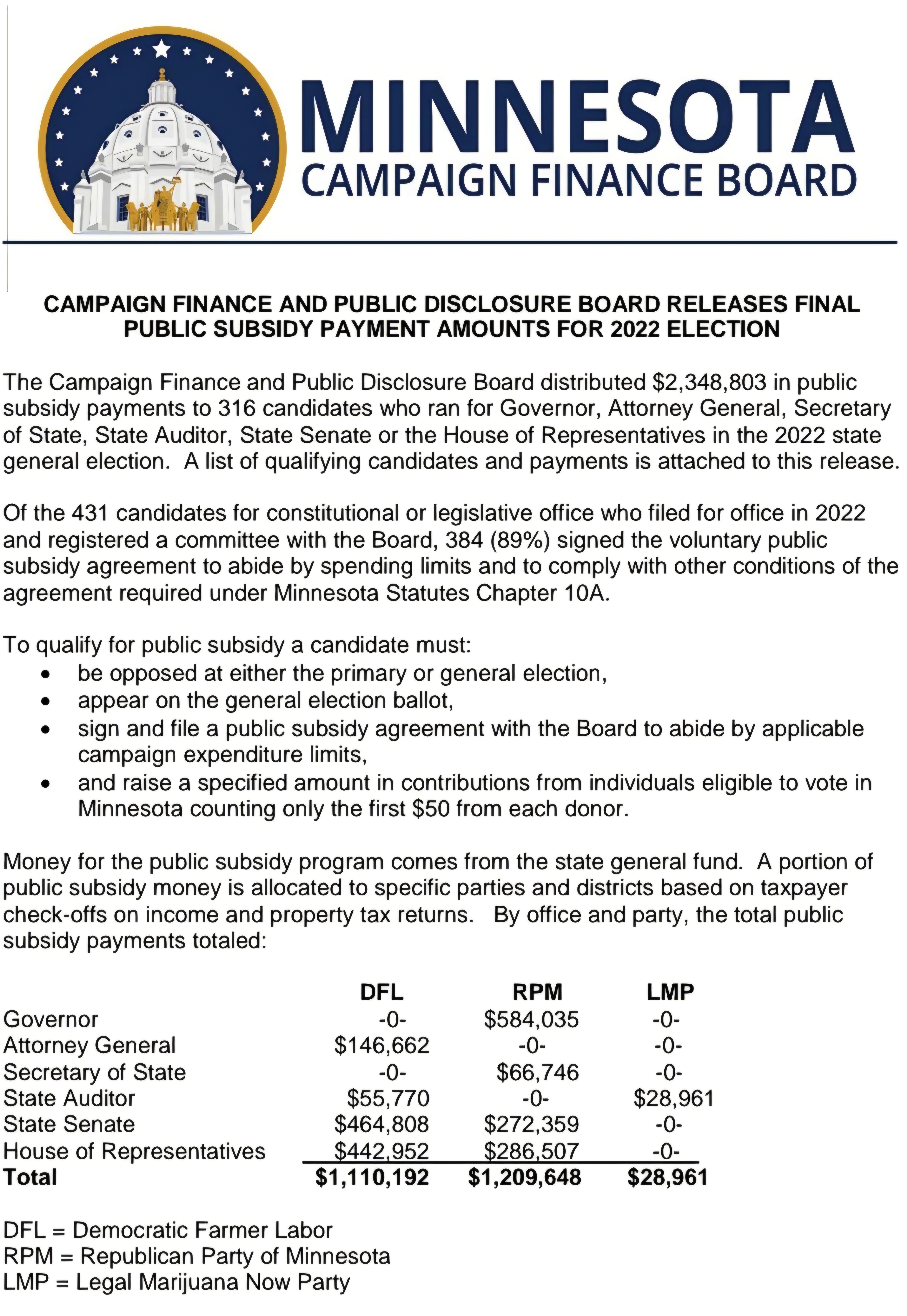 Candidates have a choice when filing for office whether to participate in the public subsidy agreement or not. The program requires your campaign to set a spending limit and in return you get thousands in tax dollars. In 2022, Jensen received over half a million dollars, Keith Ellison got over $146K, Julie Blaha got over $55K, and Kim Crockett got over $66K. See below:
