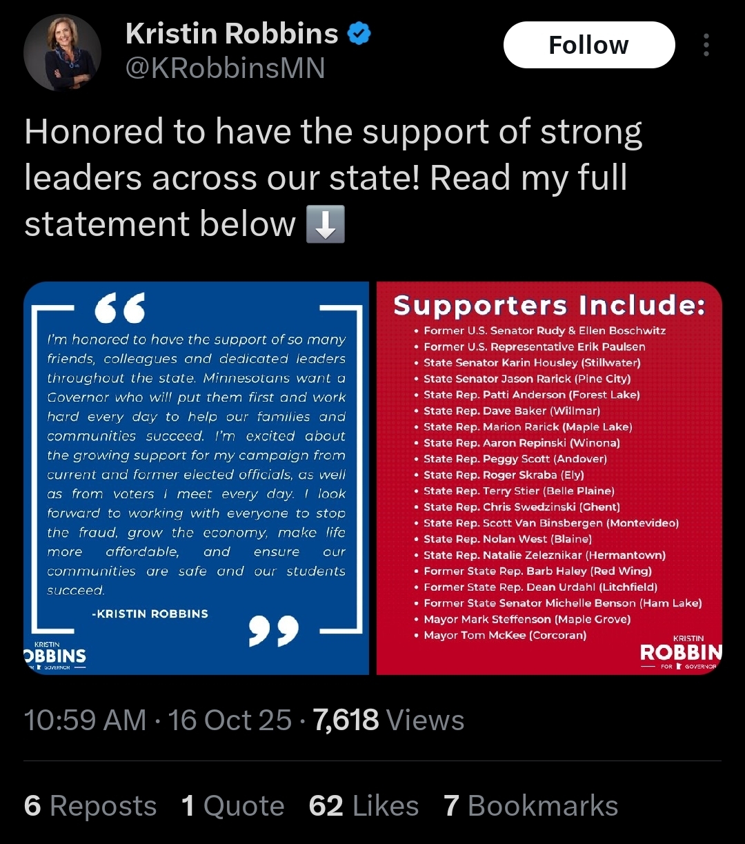 On October 16th, Robbins announced her campaign claiming to have the endorsements of sixteen current and former MN legislators and two former federal officials. See below: