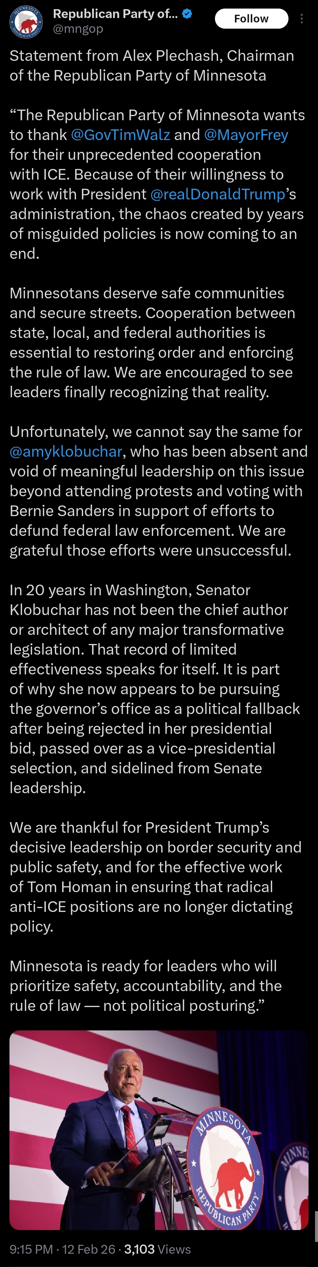 On Thursday Feb. 12th, Alex Plechash put out a statement praising Tim Walz and Jacob Frey for “their unprecedented cooperation with ICE”. Of course, Minneapolis remains a sanctuary city for illegal aliens and the two of them have done all that they can to demonize ICE agents like calling them Nazis and every other insult they could think of. See Plechash statement below: