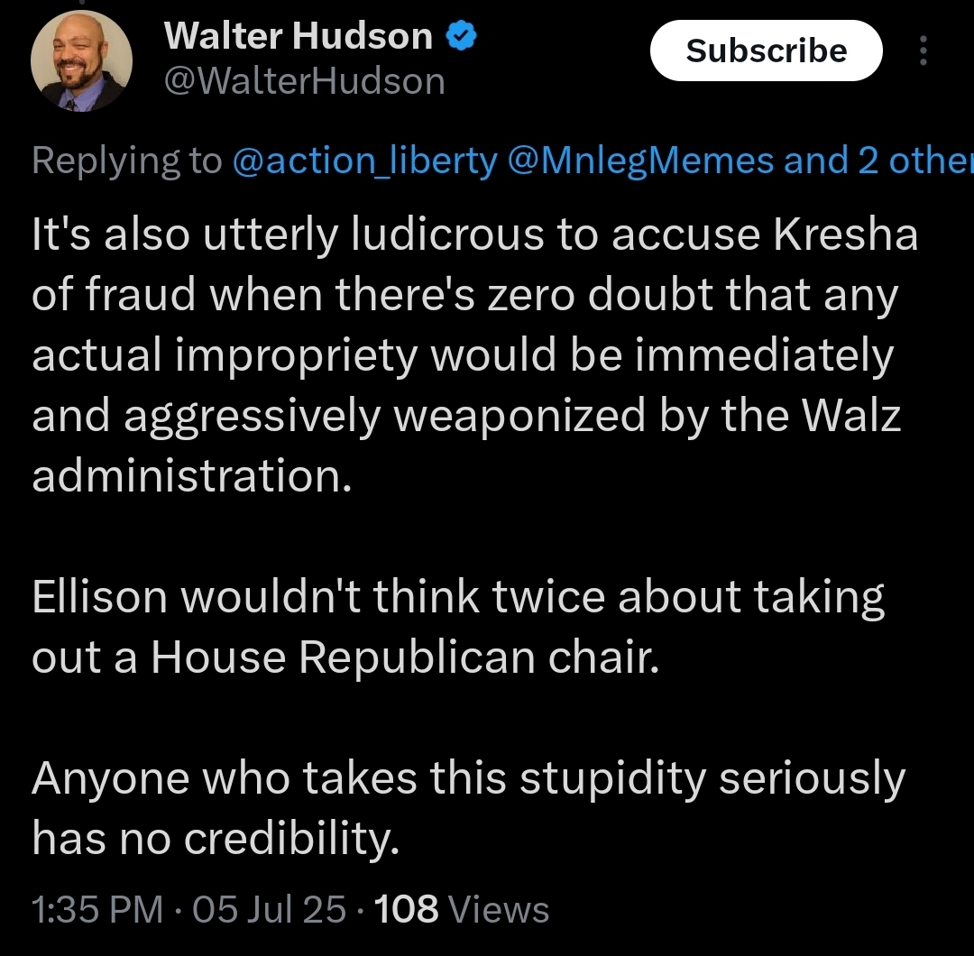 As seen in the above exchange, Hudson claims that Kresha’s PPP loans have already been litigated in court. That is NOT TRUE! Hudson has even come to admit he was wrong about that, likely because he uses sloppy Twitter A.I. as his legal research tool instead of reading primary sources like Kresha's loans and contradicting court testimony, which A4L has continued to provide to the public in our reporting. How could he even be under such a false belief if the GOP had a good "huddle" on the issue already? Hudson has proven he is an extremely unimpressive politician that spends more time on social media than doing anything productive for the conservative cause. Hudson has ingratiated himself into the St. Paul Swamp and is a loyal cultist for his RINO colleagues who seems to lack the "tremendous character" it takes to break away from group think. Hudson wants to purge A4L supporters from the MNGOP but does not want to purge the corruption out of the party!