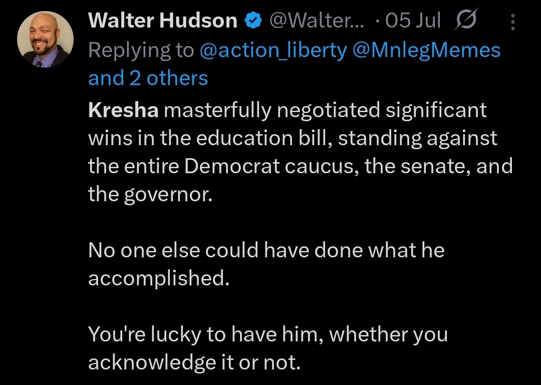 In a move that has now been criticized by fellow GOP Governor candidate Kristin Robbins, Demuth met with Tim Walz behind closed doors to negotiate the remaining omnibus budget/policy bills contributing to MN’s 2nd LARGEST budget ever. The closed door agreement led to bills that couldn’t be read until the day of, legislative leaders unanimously rejecting any and all attempts by legislators to amend legislation, and required all 14 bills be rushed through the floor on a single day. Agreed legislation that spent future surplus dollars included the abortion/Planned Parenthood funding bill, the $700M debt bill, and giving billions of tax dollars to woke universities that refuse to comply with President Trump’s Executive Orders blocking boys/men from girl’s/women's sports and locker rooms. Throwing all these bills last minute at legislators and demanding they pass it was not well-received by the GOP caucus, including Establishment puppet Walter Hudson.