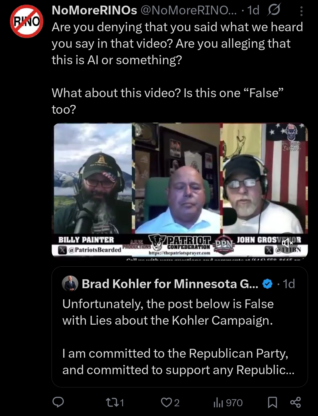 After the audio of Kohler hinting at becoming Robbins’ running mate was posted on X, Kohler inexplicably told his followers not to believe their lying ears in a since deleted X post. See below: