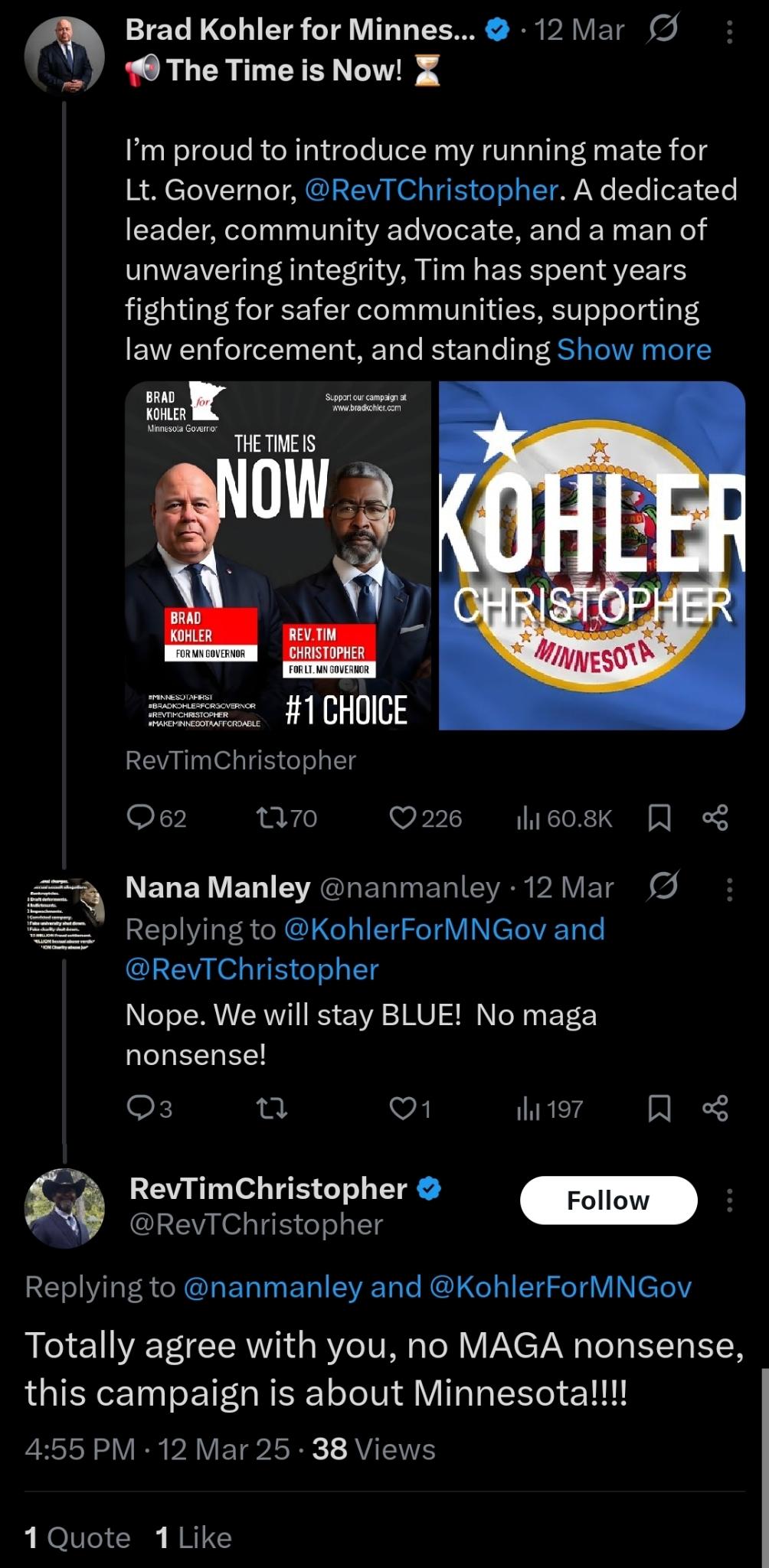 Lisa Demuth will have little credibility with conservative delegates and voters as an alternative to Walz after she and Tampon Tim were on the EXACT same page in supporting the massive, ultra-liberal, 2nd LARGEST budget in MN history during the last session. Conservatives do not want more of the same or to upgrade Demuth on the basis of racial or gender identity, conservatives want real change and leaders who will fight to shrink the size and scope of government.