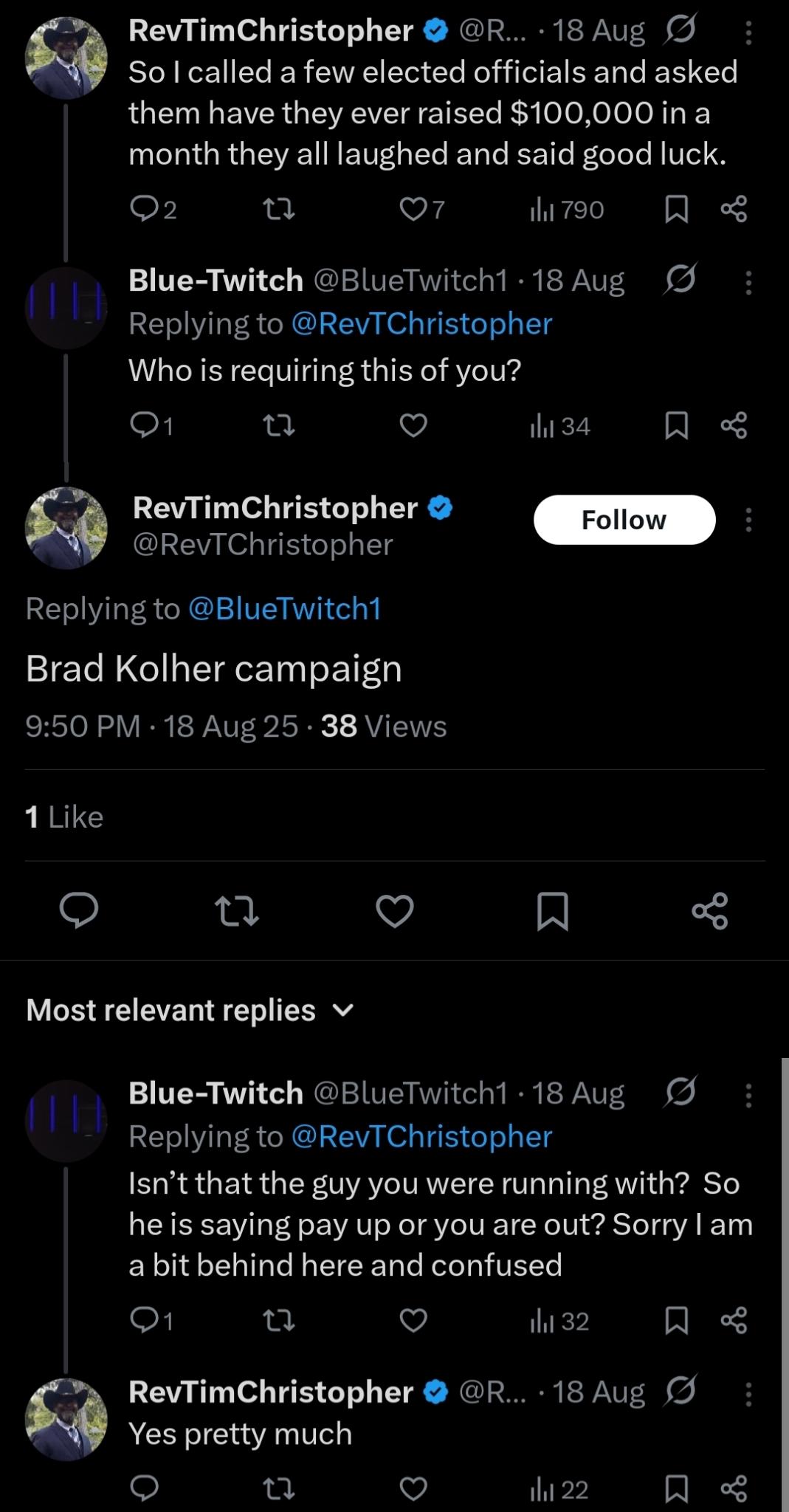 Brad Kohler previously had anti-MAGA, A4L opponent Rev. Tim Christopher as his running mate but the two later had a falling out, some of which spilled out onto social media. See below: