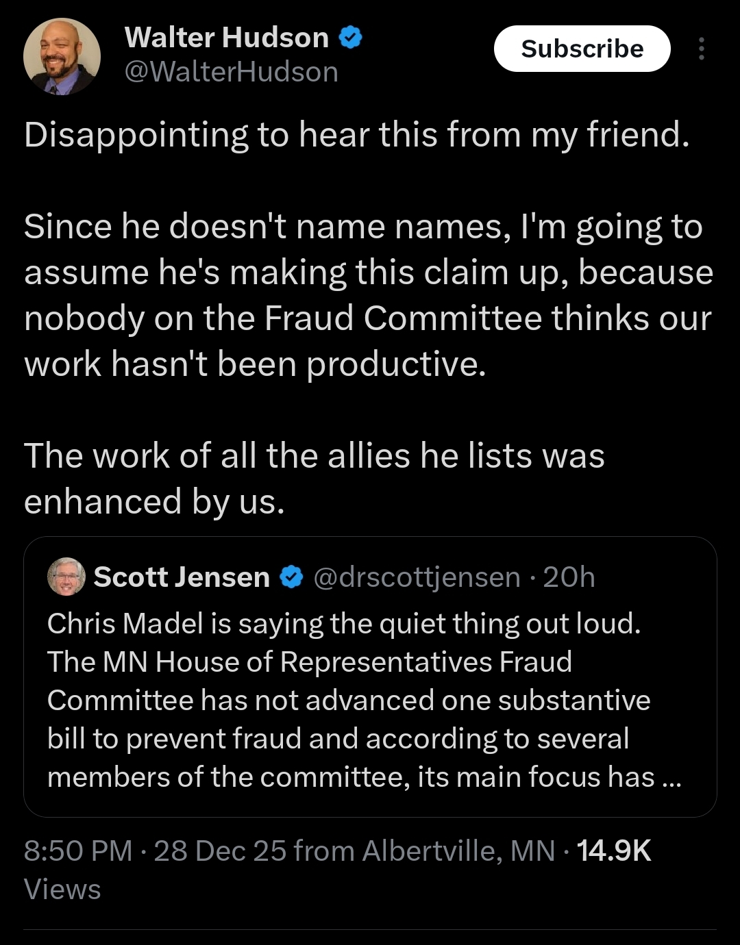 Fraud Committee Republicans including Kristin Robbins (37A), Patti Anderson (33A), Walter Hudson (30A), Marion Rarick (29B), and Isaac Schultz (10B) have failed in protecting Minnesota from fraud, they’ve only been playing politics. Nobody expected Dems to do anything but protect Walz and Somali fraud but some will be shocked to learn that the RINO committee members are equally useless!