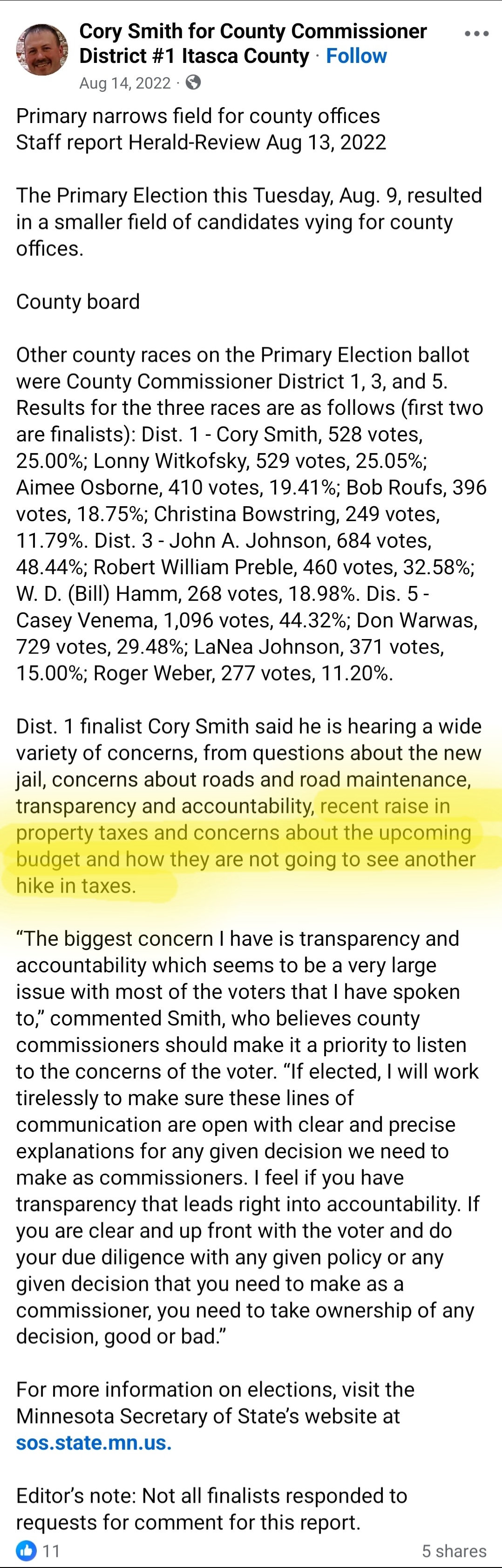 During the County Attorney battle, Commissioner Cory Smith flipped and opposed Austad’s nomination after previously supporting it. Smith credited the massive citizen input for his reversal, arguing that he could not do it after seeing how constituents reacted. Cory Smith could be the savior Itasca taxpayers need by becoming the THIRD and FINAL vote needed to block the massive tax hike!
