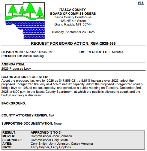 At a September 23rd Itasca County Commissioners meeting, a vote was held on the tax increase and 3 out of the 5 Commissioners supported the measure. Below you will see Commissioners John Johnson, Cory Smith, and Casey Venema support the tax hike while Commissioners Terry Snyder and Larry Hopkins voted no: