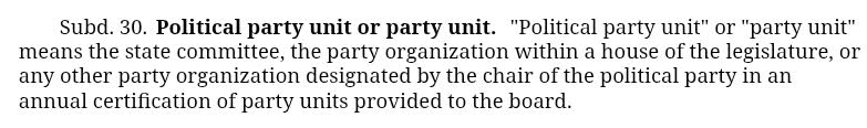 MN Statute Sec. 10A.01 subdivision 30 specifically notes that legislative blocks like the HRCC fall under the "party unit" category. See below: