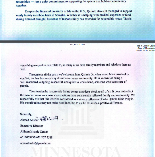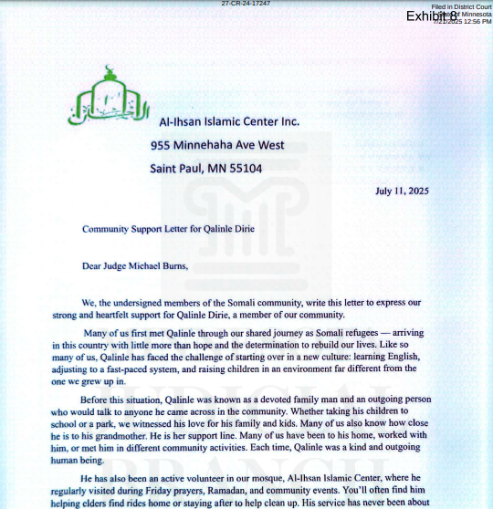 The case number for this case is 27-CR-24-17247 and all related court documents can be found using the Minnesota Court Record search. On July 21st 2025, the court put documents into the record with people testifying on behalf of Dirie’s character. Included in these testimonies was the Al-Ihsan Islamic Center with a “Community Support Letter for Qalinle Dirie”. See full letter below:
