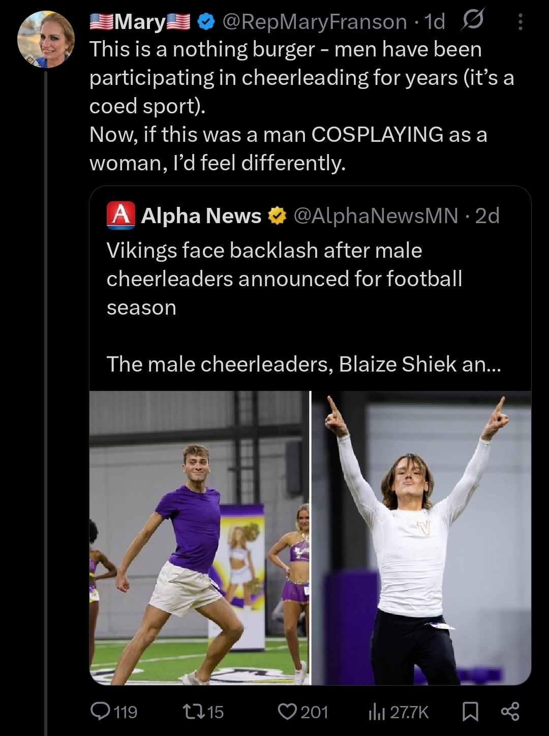 RINO Mary Franson Celebrates Woke Male Viking Cheerleaders