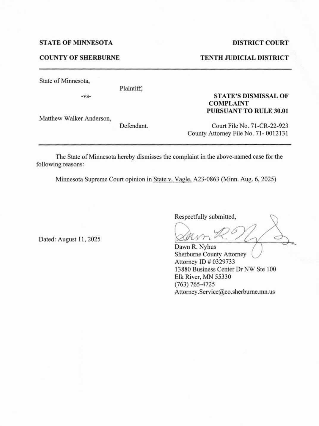 Since the MN Supreme Court issued their surprise ruling protecting citizens from this law being stretched beyond its written meaning and legislative intent, Anderson’s charges were totally dismissed as a higher court has ruled on the very same subject in another case. See the dismissal below: