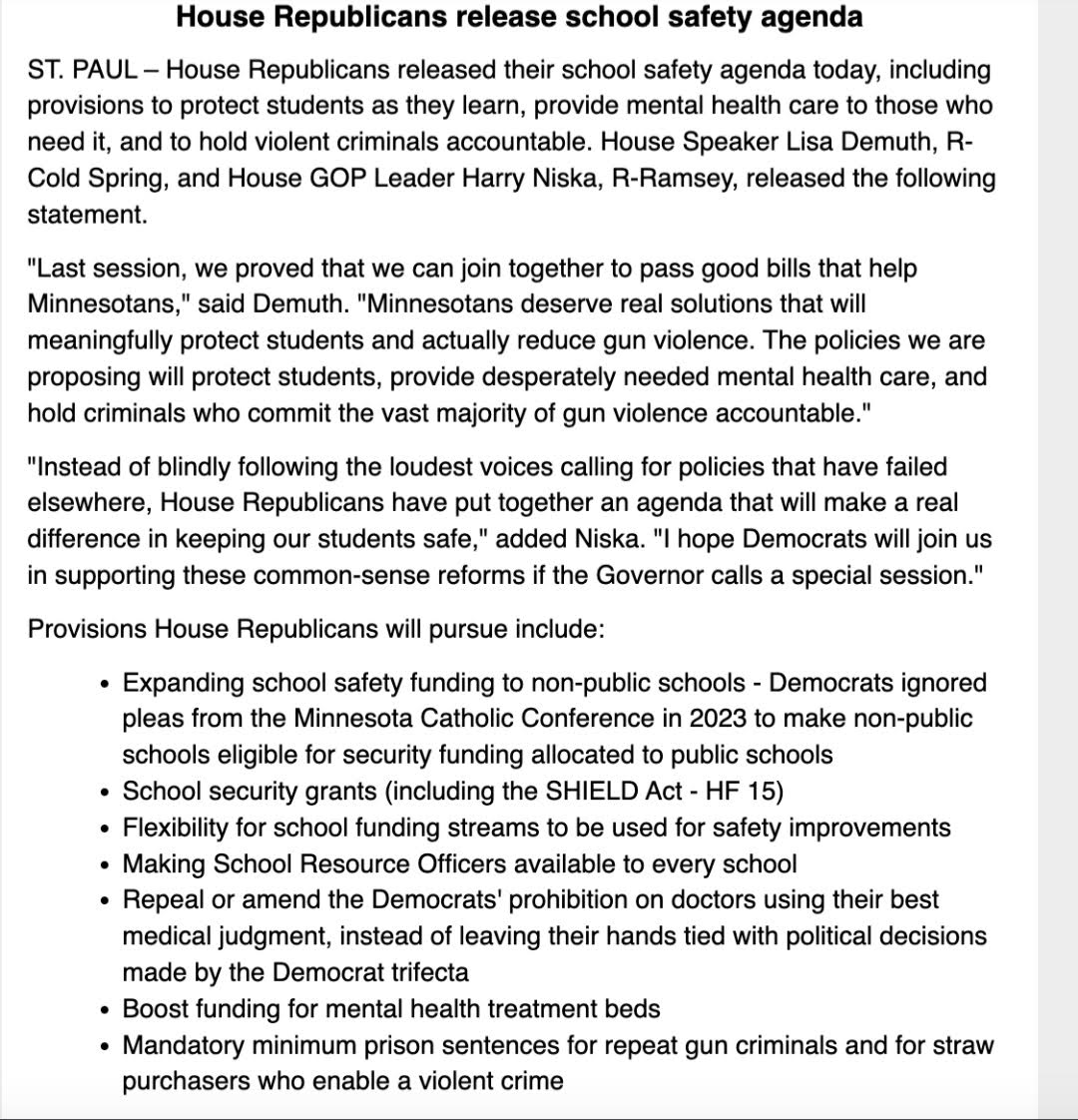 The most recent special session used to pass corrupt omnibus bills to finish out the 2nd largest biennial budget in MN history, Walz signed an agreement with House and Senate party leaders laying out the premises and bills to be passed. If a proposed gun control special session were to play out similarly, it would indicate that GOP House Speaker Lisa Demuth would have conceded the fight, even if she herself were to vote no on the proposals on the House floor.