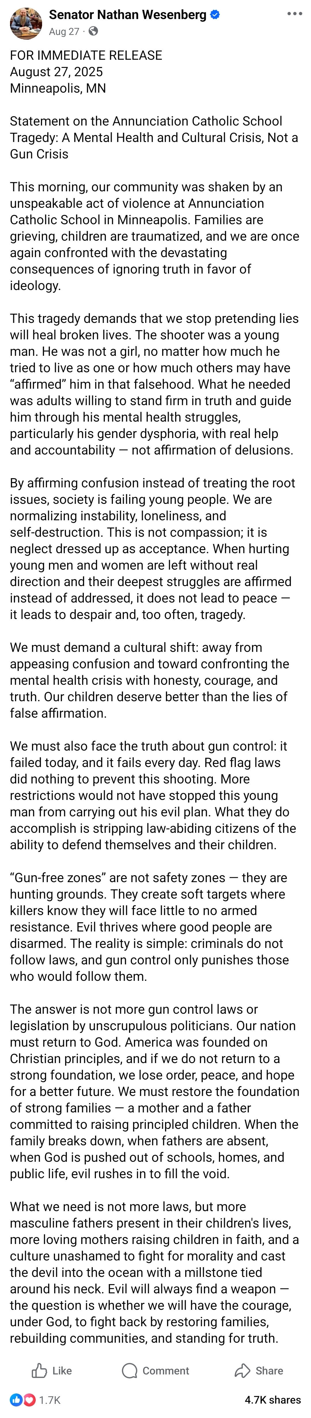 Wesenberg also got massive attention on social media following the Catholic school shooting by releasing a statement that spoke to the hearts of where conservatives are at when we see violence committed by mentally deranged individuals. See below: