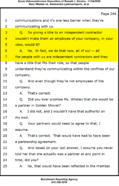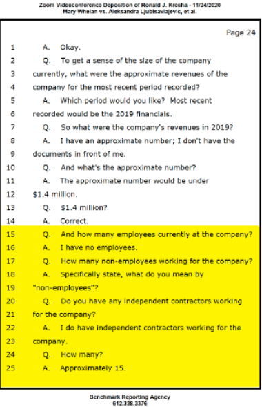 In a November 2020 deposition regarding a lawsuit involving former associate Mary Whelan, Kresha stated that the company had no employees at all and instead had about 15 independent contractors. Whelan was suing Kresha in relation to lost wages and intellectual property theft. In the deposition, the questions (Q) is Whelan’s attorney and the answers (A) are Kresha’s responses. See below: