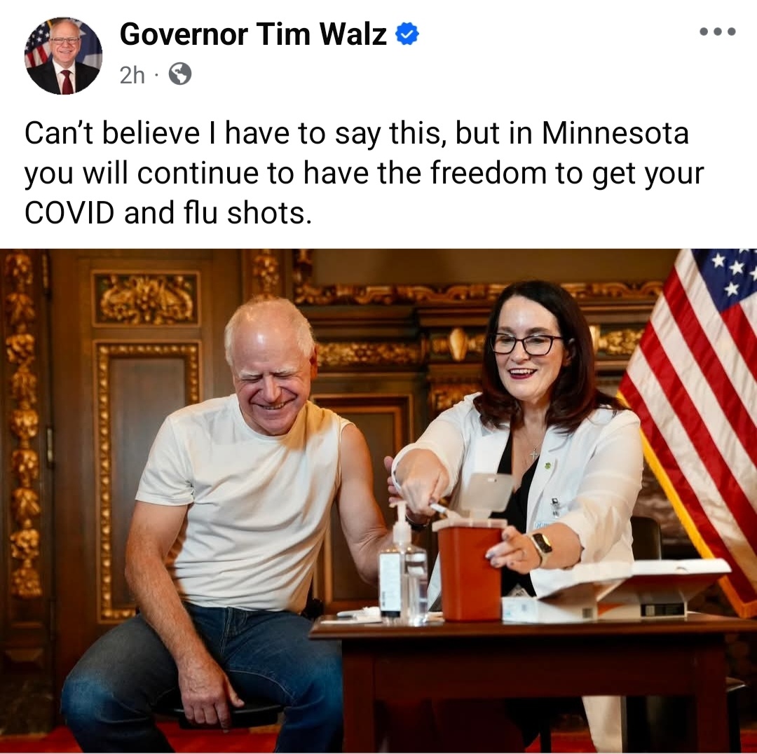 What Walz’ post is in reference to is that the CDC narrowed their Covid shot recommendation guidance to ages 65 and older or individuals younger than that at increased risk of severe Covid. This policy does not block anyone from getting a Covid shot if desired, it simply requires individuals who want the shot to consult with a doctor or pharmacist.