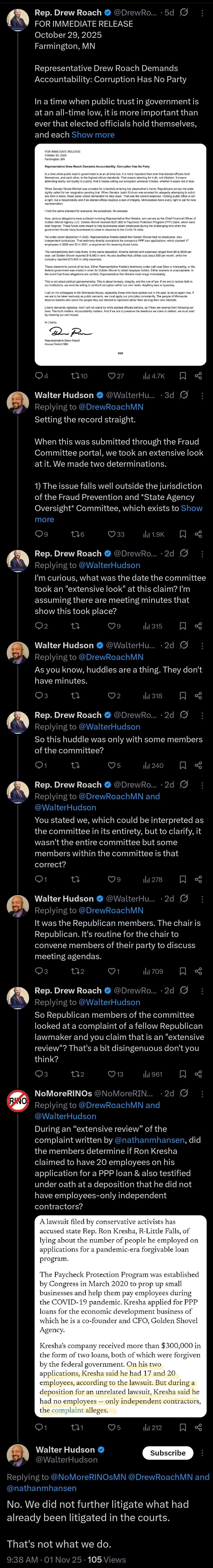 Despite members of the public reaching out to the Fraud Committee members and providing evidence through their portal, the Committee refused to take public action. It was not until this weekend that Walter Hudson admitted that the GOP members of the Fraud Committee had a “huddle” to discuss the Kresha fraud allegations. See the full exchange and push-back Hudson receives from conservative Rep. Drew Roach (58B) below: